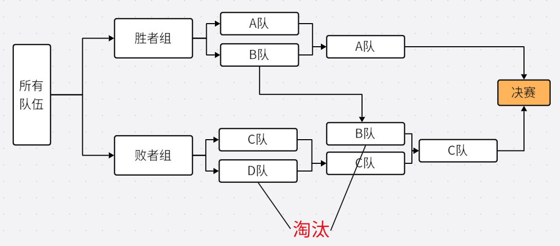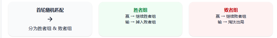 所有参赛队伍首轮随机匹配,胜者进入胜者组,败者进入败者组。 胜者组输掉的队伍会掉入败者组,败者组输掉的队伍将直接淘汰。后续的比赛,将在各自组内进行随机匹配。