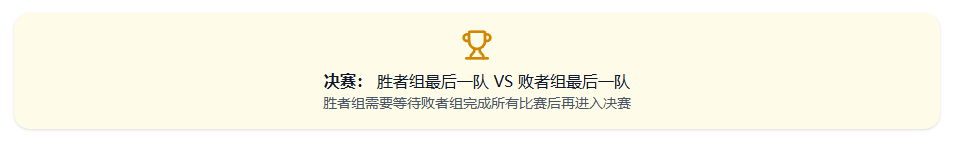 当胜者组决出留在胜者组的最后一队时,则该队伍将参加决赛。 当败者组决出留在败者组的最后一队时,则该队伍将参加决赛。 即最终决赛的参赛双方为:胜者组的最后一队VS败者组的最后一队。 由于赛制特性,胜者组的最后一队,需要耐心等待败者组的比赛全部结束,再参加最终决赛。 (按100支队伍参赛进行测算,胜者组将进行7轮比赛,败者组将进行13轮比赛)